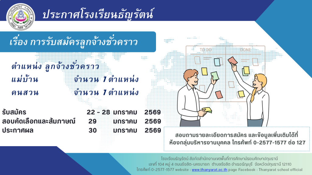 ประกาศโรงเรียนธัญรัตน์ เรื่อง การรับสมัครลูกจ้างชั่วคราว มกราคม 22, 2026มกราคม 22, 2026 นางสาวชัชฎาภรณ์ ภูตันวงษ์ ข่าวประชาสัมพันธ์ ลงนามประกาศดาวน์โหลด Share this:FacebookX Related นางสาวชัชฎาภรณ์ ภูตันวงษ์