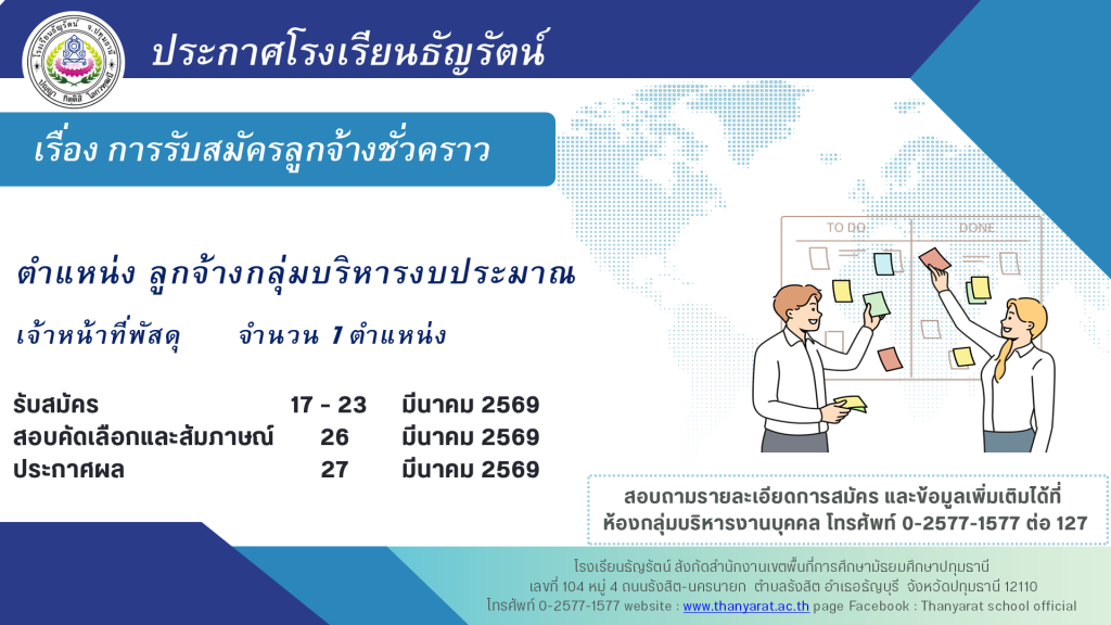 ประกาศโรงเรียนธัญรัตน์ เรื่องรับสมัครลูกจ้างชั่วคราว มีนาคม 17, 2026มีนาคม 17, 2026 นางสาวชัชฎาภรณ์ ภูตันวงษ์ ข่าวประชาสัมพันธ์ ประกาศรับสมัครลูกจ้างชั่วคราว ตำแหน่งพัสดาวน์โหลด Share this:FacebookX Related นางสาวชัชฎาภรณ์ ภูตันวงษ์