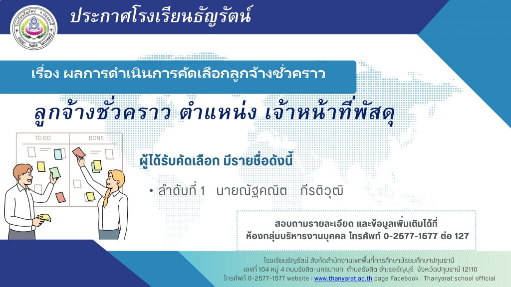 ประกาศโรงเรียนธัญรัตน์ เรื่อง ผลการดำเนินการคัดเลือกลูกจ้างชั่วคราว ตำแหน่ง เจ้าหน้าที่พัสดุ มีนาคม 27, 2026มีนาคม 27, 2026 นางสาวชัชฎาภรณ์ ภูตันวงษ์ ข่าวประชาสัมพันธ์ ประกาศผลลูกจ้างชั่วคราว ตำแหน่งพัสดุดาวน์โหลด Share this:FacebookX Related นางสาวชัชฎาภรณ์ ภูตันวงษ์