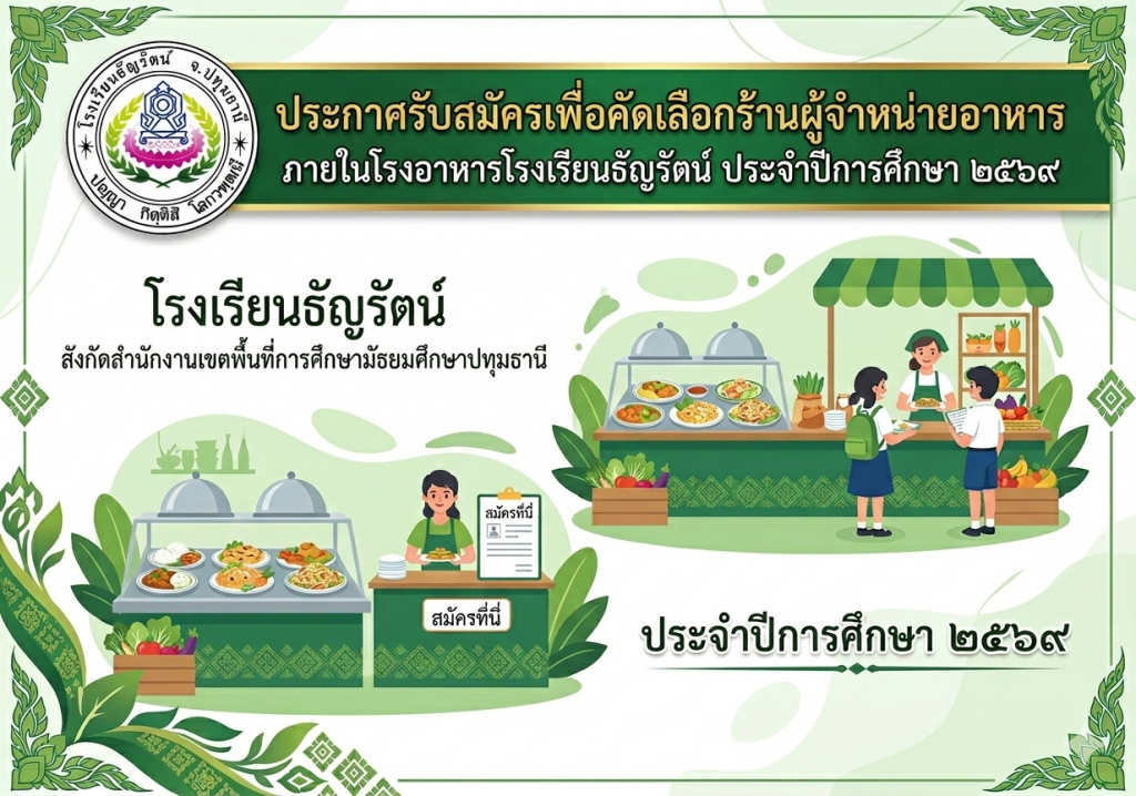 ประกาศ รับสมัครเพื่อคัดเลือกร้านผู้จำหน่ายอาหาร ภายในโรงอาหารโรงเรียนธัญรัตน์ ประจำปีการศึกษา ๒๕๖๙ มีนาคม 31, 2026 admintr ข่าวประชาสัมพันธ์ ประกาศรับสมัครร้านอาหารดาวน์โหลด Share this:FacebookX Related admintr